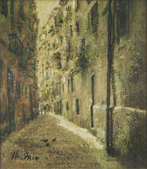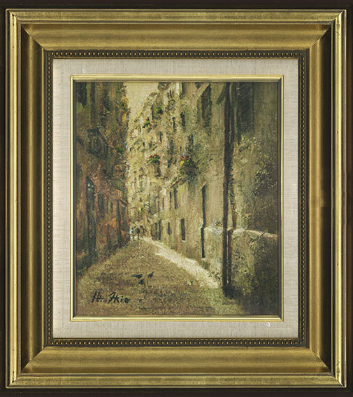 油彩 キャンバス サイン 裏にもサイン、タイトル 日本美術家連盟シール F3号 26.5×21 額43×37.5
